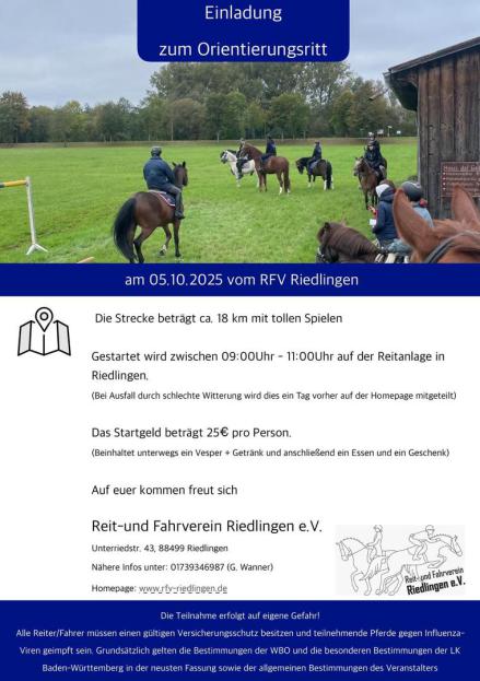 Während der Veranstaltungen des RFV-Riedlingen werden regelmäßig Foto- und /oder Filmaufnahmen gemacht, welche auf unserer Homepage, Facebookseite, Tageszeitung u.ä. veröffentlicht werden. Mit dem Betreten des Geländes sowie der Räumlichkeiten/Reithallen des RFV-Riedlingen erfolgt die Einwilligung der anwesenden Personen zur unentgeltlichen Veröffentlichung und zwar ohne dass es einer ausdrücklichen Erklärung der betreffenden Personen bedarf.